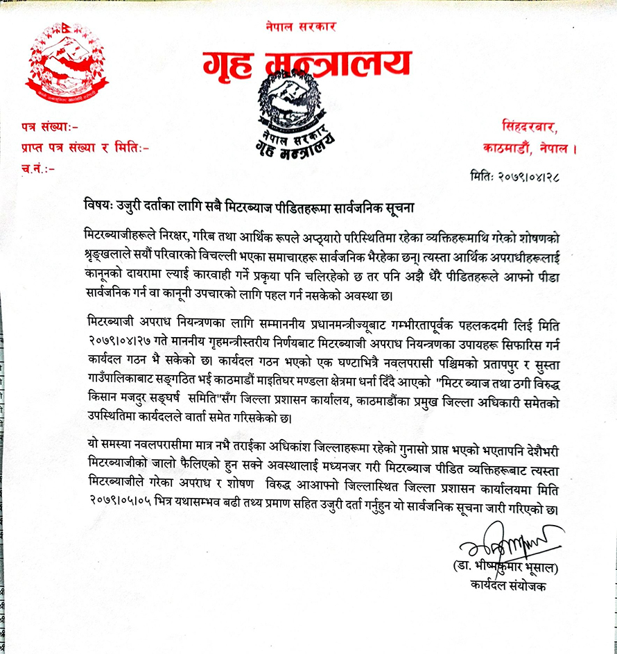‘मुलुकभर नै मिटरब्याजीको जालो फैलिएको हुनसक्ने अवस्थालाई मध्यनजर गरी मिटरब्याज पीडितबाट त्यस्ता मिटरब्याजीले गरेका अपराध र शोषणविरुद्ध आ–आफ्नो जिल्लास्थित प्रशासन कार्यालयमा आगामी भदौ ५ गतेभित्र यथासम्भव बढी तथ्य र प्रमाणसहित उजुरी दर्ता गर्न सार्वजनिक सूचना जारी गरिएको छ’, कार्यदलका संयोजक डा भीष्मकुमार भुसालद्वारा जारी सूचनामा भनिएको छ ।