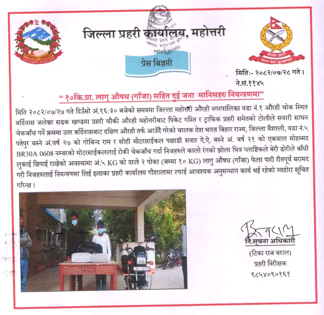 महोत्तरी। महोत्तरी जिल्लाको औरही नगरपालिका-१, औरही चोकस्थित बर्दिवास-जलेश्वर सडकखण्डमा प्रहरीले १० किलो गाँजा सहित दुई जनालाई नियन्त्रणमा लिएको छ।