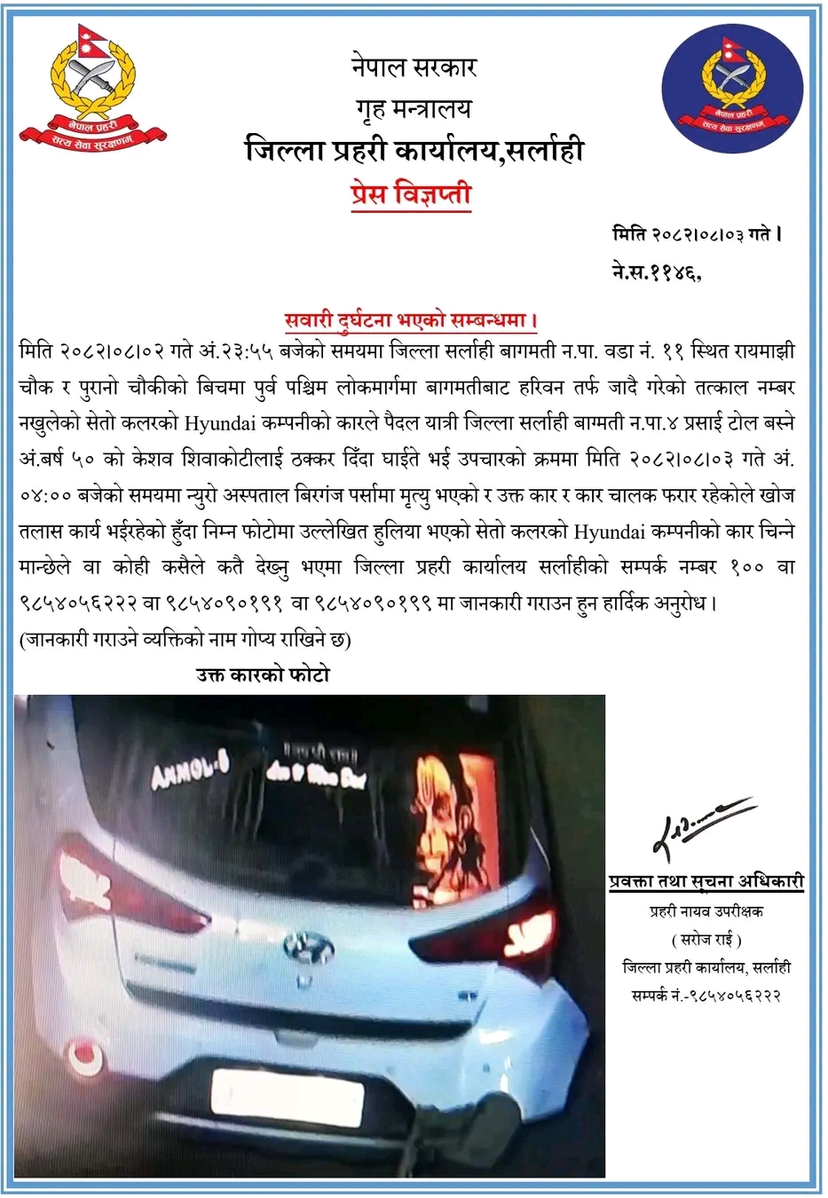 जानकारीका लागि सम्पर्क नम्बरहरूः १००, ९८५४०५६२२२, ९८५४०९०१९९१, ९८५४०९०१९९