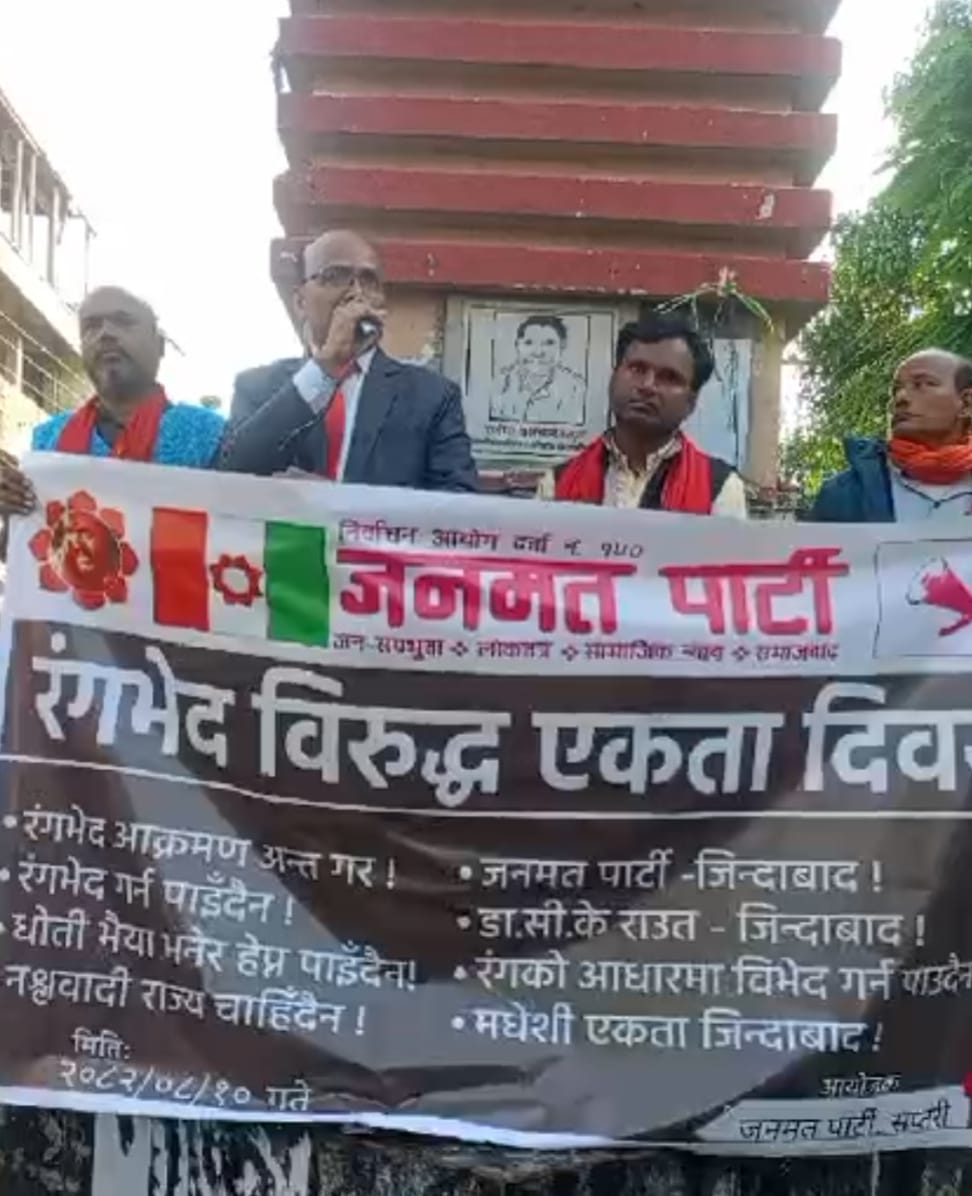 राजविराज – चन्दन रजक। जनमत पार्टीका राष्ट्रिय उपाध्यक्ष तथा संगठन विभाग प्रमुख डा. जयकान्त राउतले नेपालमा वर्षौँदेखि मधेशी, थारु, आदिवासी–जनजाति लगायतका समुदायमाथि राज्य तथा शासक वर्गबाट नश्ल, रंग र वर्णको आधारमा दुव्र्यवहार हुँदै आएको स्पष्ट बताएका छन्।