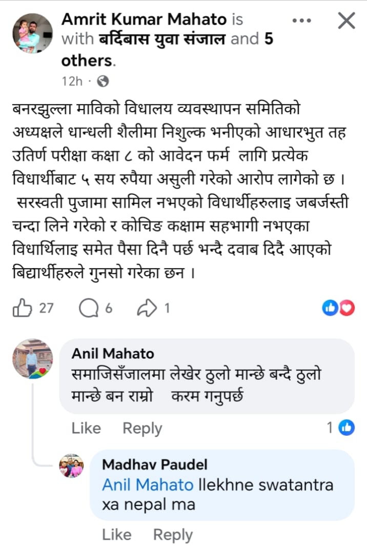 विद्यालय व्यवस्थापन समितिका सदस्य अमृत कुमार महतोले निःशुल्क भनिएको आवेदन फारमका लागि विद्यार्थीबाट रकम लिइएको आरोप लगाएका छन्। उनका अनुसार, “आधारभूत तह उत्तीर्ण परीक्षा आवेदन फारम निःशुल्क भनिएको थियो, तर प्रत्येक विद्यार्थीबाट ५ सय रुपैयाँ असुली गरिएको छ, जुन सरासर गलत हो।”