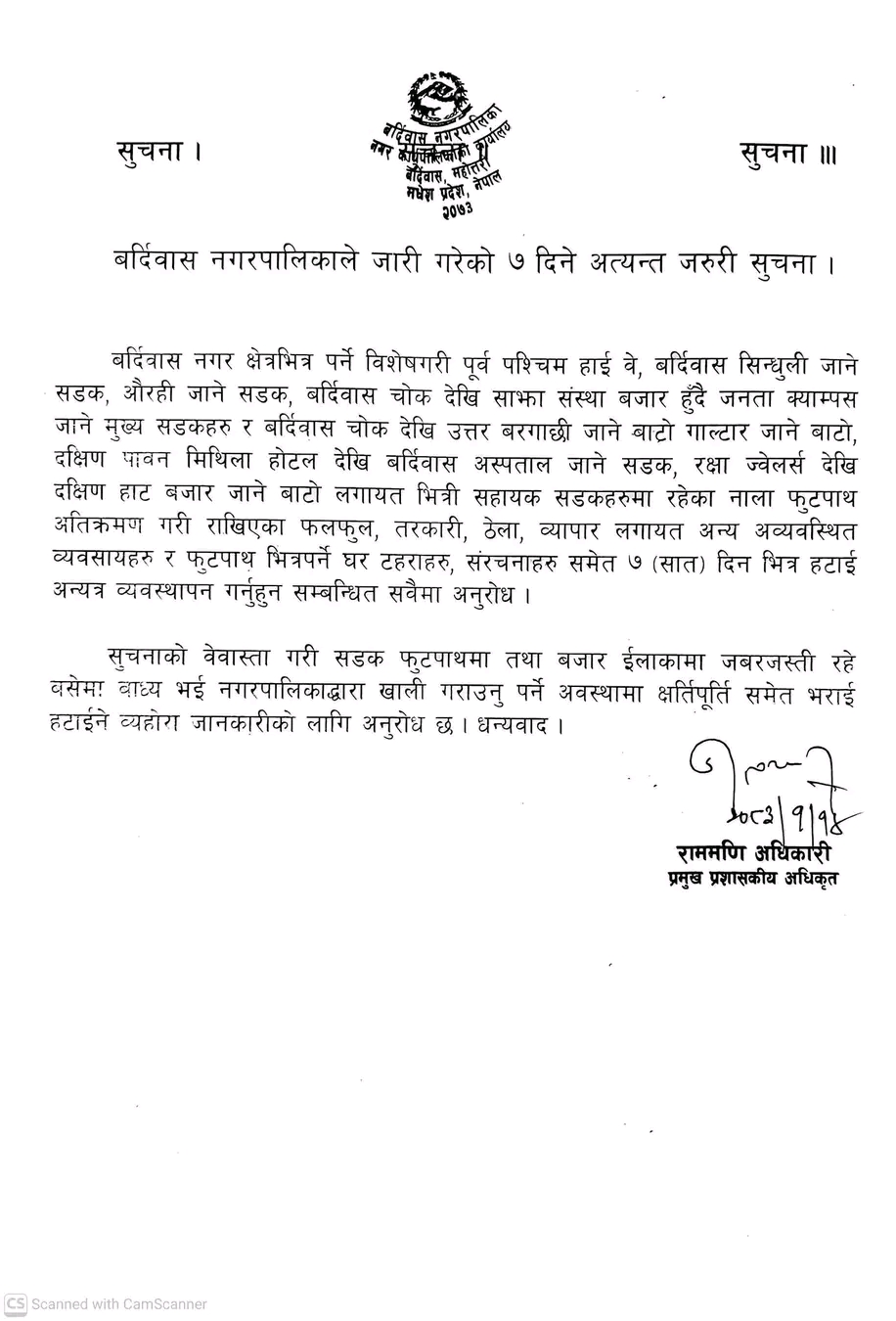 नगरपालिकाद्वारा जारी अत्यन्त जरुरी सूचनाअनुसार पूर्व-पश्चिम राजमार्ग, बर्दिवास-सिन्धुली सडक, औरही जाने सडक, बर्दिवास चोकदेखि साझा संस्था बजार हुँदै जनता क्याम्पस जाने मुख्य मार्ग, बर्दिवास चोकदेखि उत्तर बरगाछी तथा गाल्टार जाने बाटो, दक्षिणतर्फ पावन मिथिला होटलदेखि नव क्षितिज कलेज बाटो हुँदै-बर्दिवास अस्पताल जाने सडक, रक्षा ज्वेलर्सदेखि दक्षिण हाट बजार जाने मार्गलगायतका स्थानमा अतिक्रमण हटाउन निर्देशन दिइएको हो।
